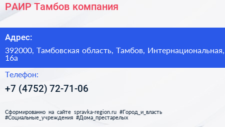 РАИР-Тамбов, компания по адресу 392000, Тамбовская область, Тамбов, Интернациональная, 16а в дальнейшем Организация, размещена в следующих категориях: