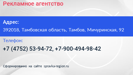 Рекламное агентство по адресу 392018, Тамбовская область, Тамбов, Мичуринская, 92 в дальнейшем Организация, размещена в следующих категориях: