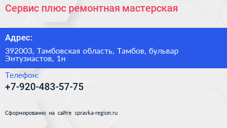 Сервис плюс, ремонтная мастерская по адресу 392003, Тамбовская область, Тамбов, бульвар Энтузиастов, 1н в дальнейшем Организация, размещена в следующих категориях: