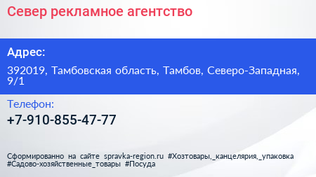 Север, рекламное агентство по адресу 392019, Тамбовская область, Тамбов, Северо-Западная, 9/1 в дальнейшем Организация, размещена в следующих категориях: