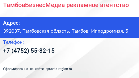ТамбовБизнесМедиа, рекламное агентство по адресу 392037, Тамбовская область, Тамбов, Ипподромная, 5 в дальнейшем Организация, размещена в следующих категориях: