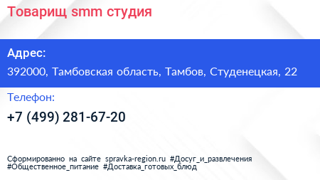 Товарищ, smm-студия по адресу 392000, Тамбовская область, Тамбов, Студенецкая, 22 в дальнейшем Организация, размещена в следующих категориях: