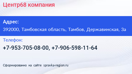 Центр68, компания по адресу 392000, Тамбовская область, Тамбов, Державинская, 3а в дальнейшем Организация, размещена в следующих категориях:
