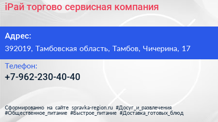 iРай, торгово-сервисная компания по адресу 392019, Тамбовская область, Тамбов, Чичерина, 17 в дальнейшем Организация, размещена в следующих категориях: