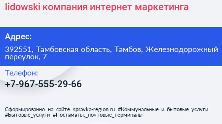lidowski, компания интернет маркетинга по адресу 392551, Тамбовская область, Тамбов, Железнодорожный переулок, 7 в дальнейшем Организация, размещена в следующих категориях: