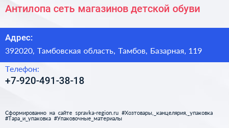 Антилопа, сеть магазинов детской обуви по адресу 392020, Тамбовская область, Тамбов, Базарная, 119 в дальнейшем Организация, размещена в следующих категориях:
