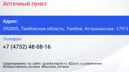 Аптечный пункт по адресу 392005, Тамбовская область, Тамбов, Астраханская, 179/1 в дальнейшем Организация, размещена в следующих категориях: