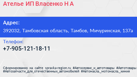 Ателье, ИП Власенко Н.А. по адресу 392032, Тамбовская область, Тамбов, Мичуринская, 137а в дальнейшем Организация, размещена в следующих категориях: