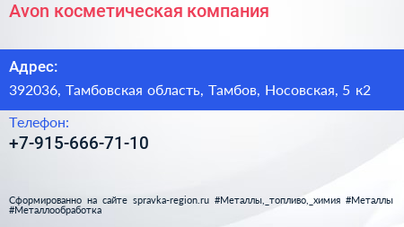 Avon, косметическая компания по адресу 392036, Тамбовская область, Тамбов, Носовская, 5 к2 в дальнейшем Организация, размещена в следующих категориях: