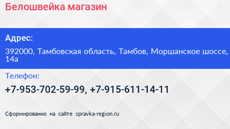 Белошвейка, магазин по адресу 392000, Тамбовская область, Тамбов, Моршанское шоссе, 14а в дальнейшем Организация, размещена в следующих категориях: