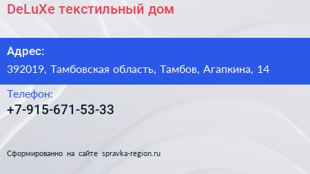 DeLuXe, текстильный дом по адресу 392019, Тамбовская область, Тамбов, Агапкина, 14 в дальнейшем Организация, размещена в следующих категориях: