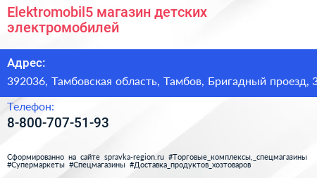 Elektromobil5, магазин детских электромобилей по адресу 392036, Тамбовская область, Тамбов, Бригадный проезд, 3 в дальнейшем Организация, размещена в следующих категориях:
