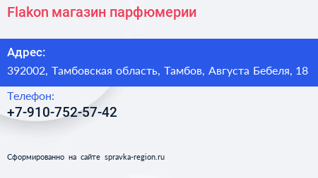 Flakon, магазин парфюмерии по адресу 392002, Тамбовская область, Тамбов, Августа Бебеля, 18 в дальнейшем Организация, размещена в следующих категориях:
