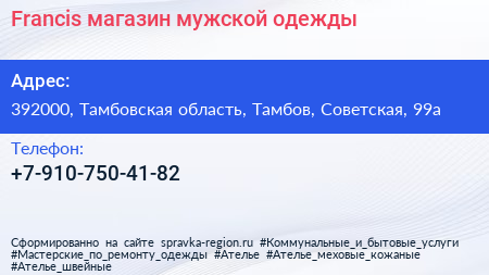 Francis, магазин мужской одежды по адресу 392000, Тамбовская область, Тамбов, Советская, 99а в дальнейшем Организация, размещена в следующих категориях: