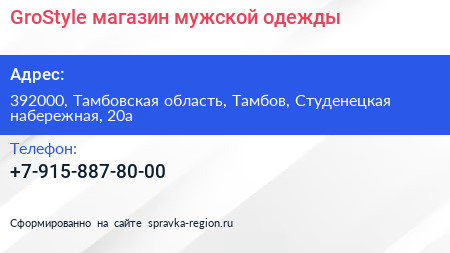 GroStyle, магазин мужской одежды по адресу 392000, Тамбовская область, Тамбов, Студенецкая набережная, 20а в дальнейшем Организация, размещена в следующих категориях: