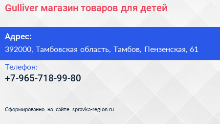 Gulliver, магазин товаров для детей по адресу 392000, Тамбовская область, Тамбов, Пензенская, 61 в дальнейшем Организация, размещена в следующих категориях: