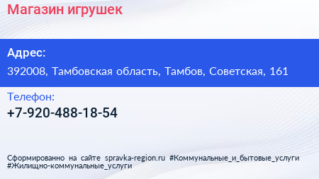 Магазин игрушек по адресу 392008, Тамбовская область, Тамбов, Советская, 161 в дальнейшем Организация, размещена в следующих категориях: