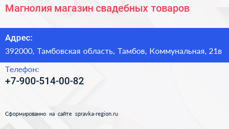 Магнолия, магазин свадебных товаров по адресу 392000, Тамбовская область, Тамбов, Коммунальная, 21в в дальнейшем Организация, размещена в следующих категориях: