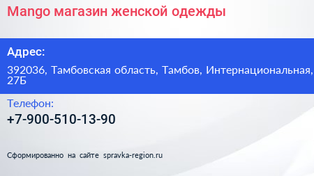 Mango, магазин женской одежды по адресу 392036, Тамбовская область, Тамбов, Интернациональная, 27Б в дальнейшем Организация, размещена в следующих категориях: