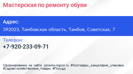 Мастерская по ремонту обуви по адресу 392023, Тамбовская область, Тамбов, Советская, 7 в дальнейшем Организация, размещена в следующих категориях: