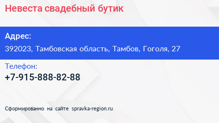 Невеста, свадебный бутик по адресу 392023, Тамбовская область, Тамбов, Гоголя, 27 в дальнейшем Организация, размещена в следующих категориях: