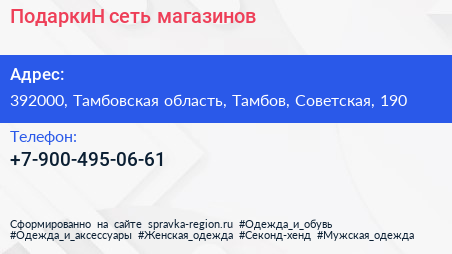 ПодаркиН, сеть магазинов по адресу 392000, Тамбовская область, Тамбов, Советская, 190 в дальнейшем Организация, размещена в следующих категориях: