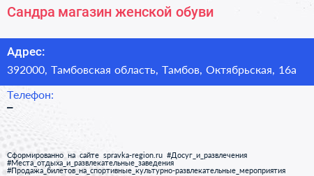 Сандра, магазин женской обуви по адресу 392000, Тамбовская область, Тамбов, Октябрьская, 16а в дальнейшем Организация, размещена в следующих категориях: