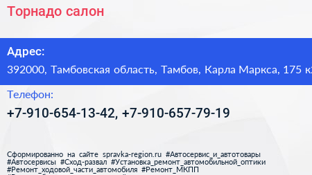 Торнадо, салон по адресу 392000, Тамбовская область, Тамбов, Карла Маркса, 175 к2 в дальнейшем Организация, размещена в следующих категориях:
