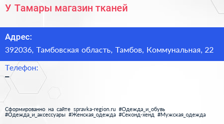 У Тамары, магазин тканей по адресу 392036, Тамбовская область, Тамбов, Коммунальная, 22 в дальнейшем Организация, размещена в следующих категориях: