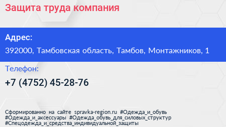 Защита труда, компания по адресу 392000, Тамбовская область, Тамбов, Монтажников, 1 в дальнейшем Организация, размещена в следующих категориях: