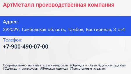 АртМеталл, производственная компания по адресу 392029, Тамбовская область, Тамбов, Бастионная, 3 ст4 в дальнейшем Организация, размещена в следующих категориях: