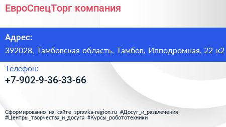 ЕвроСпецТорг, компания по адресу 392028, Тамбовская область, Тамбов, Ипподромная, 22 к2 в дальнейшем Организация, размещена в следующих категориях: