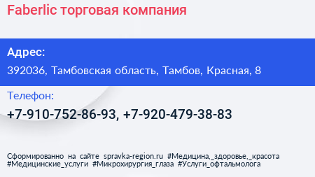 Faberlic, торговая компания по адресу 392036, Тамбовская область, Тамбов, Красная, 8 в дальнейшем Организация, размещена в следующих категориях: