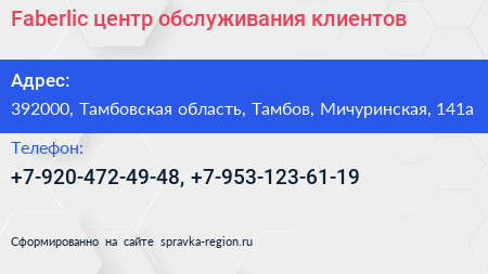 Faberlic, центр обслуживания клиентов по адресу 392000, Тамбовская область, Тамбов, Мичуринская, 141а в дальнейшем Организация, размещена в следующих категориях: