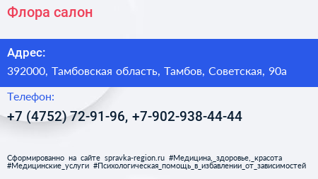 Флора, салон по адресу 392000, Тамбовская область, Тамбов, Советская, 90а в дальнейшем Организация, размещена в следующих категориях: