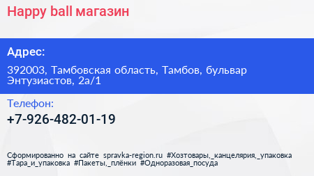 Happy ball, магазин по адресу 392003, Тамбовская область, Тамбов, бульвар Энтузиастов, 2а/1 в дальнейшем Организация, размещена в следующих категориях: