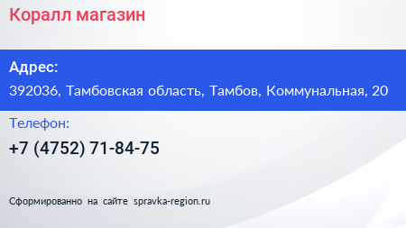 Коралл, магазин по адресу 392036, Тамбовская область, Тамбов, Коммунальная, 20 в дальнейшем Организация, размещена в следующих категориях: