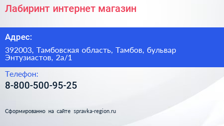 Лабиринт, интернет-магазин по адресу 392003, Тамбовская область, Тамбов, бульвар Энтузиастов, 2а/1 в дальнейшем Организация, размещена в следующих категориях: