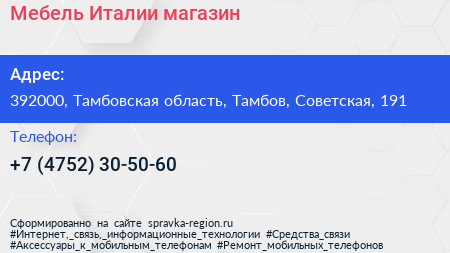Мебель Италии, магазин по адресу 392000, Тамбовская область, Тамбов, Советская, 191 в дальнейшем Организация, размещена в следующих категориях: