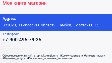 Моя книга, магазин по адресу 392023, Тамбовская область, Тамбов, Советская, 11 в дальнейшем Организация, размещена в следующих категориях: