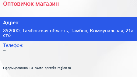 Оптовичок, магазин по адресу 392000, Тамбовская область, Тамбов, Коммунальная, 21а ст6 в дальнейшем Организация, размещена в следующих категориях: