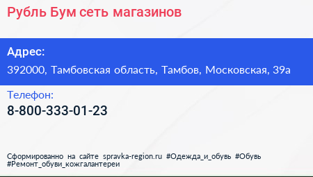 Рубль Бум, сеть магазинов по адресу 392000, Тамбовская область, Тамбов, Московская, 39а в дальнейшем Организация, размещена в следующих категориях: