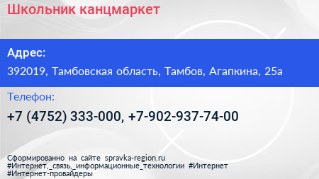 Школьник, канцмаркет по адресу 392019, Тамбовская область, Тамбов, Агапкина, 25а в дальнейшем Организация, размещена в следующих категориях: