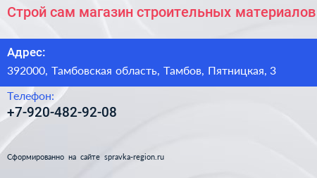 Строй сам, магазин строительных материалов по адресу 392000, Тамбовская область, Тамбов, Пятницкая, 3 в дальнейшем Организация, размещена в следующих категориях: