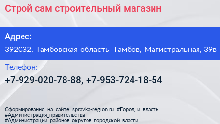 Строй сам, строительный магазин по адресу 392032, Тамбовская область, Тамбов, Магистральная, 39в в дальнейшем Организация, размещена в следующих категориях:
