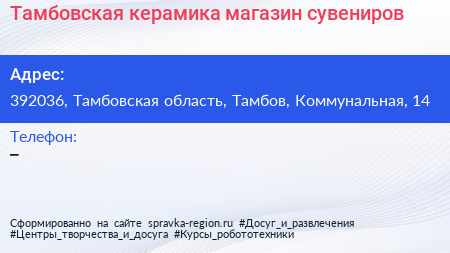 Тамбовская керамика, магазин сувениров по адресу 392036, Тамбовская область, Тамбов, Коммунальная, 14 в дальнейшем Организация, размещена в следующих категориях: