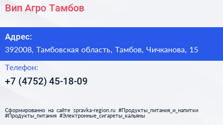 Вип-Агро-Тамбов по адресу 392008, Тамбовская область, Тамбов, Чичканова, 15 в дальнейшем Организация, размещена в следующих категориях: