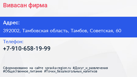 Вивасан, фирма по адресу 392002, Тамбовская область, Тамбов, Советская, 60 в дальнейшем Организация, размещена в следующих категориях: