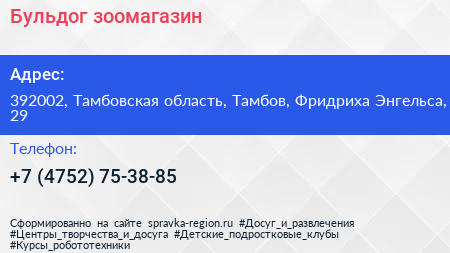 Бульдог, зоомагазин по адресу 392002, Тамбовская область, Тамбов, Фридриха Энгельса, 29 в дальнейшем Организация, размещена в следующих категориях: