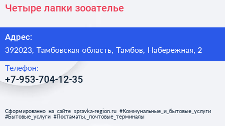 Четыре лапки, зооателье по адресу 392023, Тамбовская область, Тамбов, Набережная, 2 в дальнейшем Организация, размещена в следующих категориях: